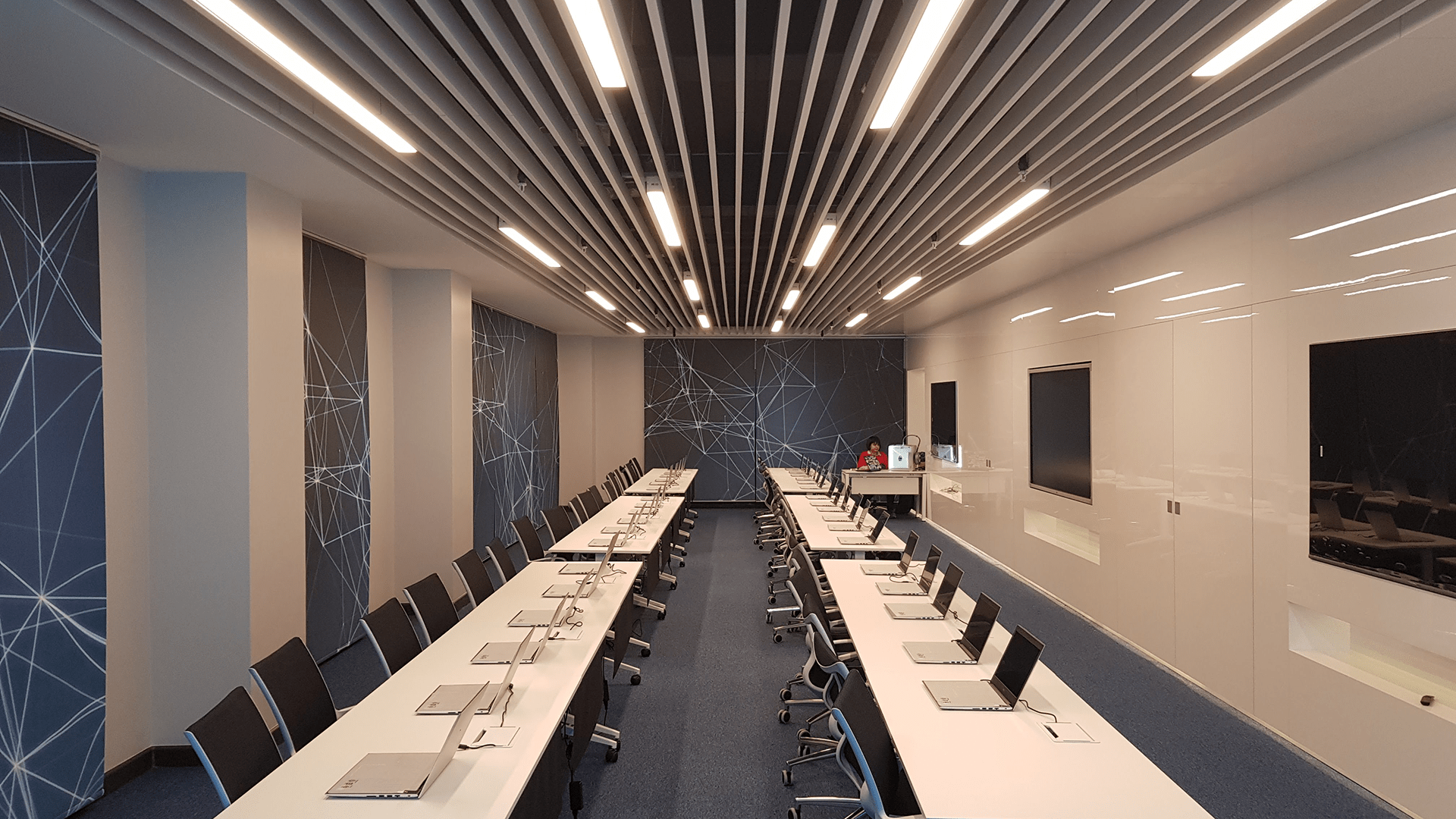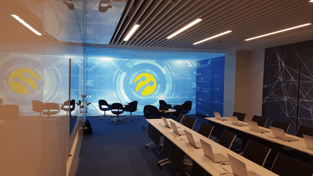 Mekânda Turkcell’in kurumsal güçlü kimliğini mekânın merkezine taşırken; sade çizgiler, net formlar ve teknolojik detaylar modern bir atmosfer yaratır. Aydınlatma, akustik ve donanım çözümleri, toplantı, sunum ve beyin fırtınası gibi farklı kullanım senaryolarına esnek biçimde yanıt verecek şekilde tasarlanmıştır. Böylece alan, yalnızca bir toplantı mekânı olmanın ötesine geçerek yenilikçi düşüncenin, dijital dönüşümün ve kurumsal kültürün mekânsal bir ifadesi haline gelmiştir.